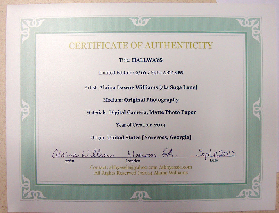The last example is of a present day modern format of certificate of authenticity and signed limited edition. Many artists today have the option to print on demand, which is initially less expensive and minimizes storage requirements. An artist can display artwork for sale, in it's original form - whether it's a painting, photograph, or what have you, then have a high quality print made as needed. Here is one of my own photography prints, recently printed on demand: "Hallways" Ltd Edition 2/10